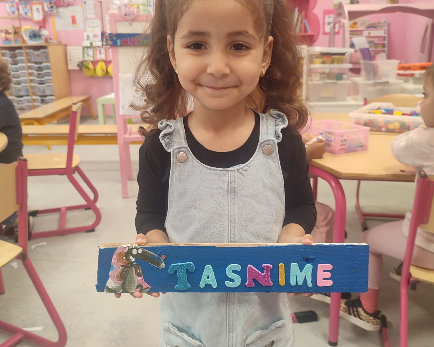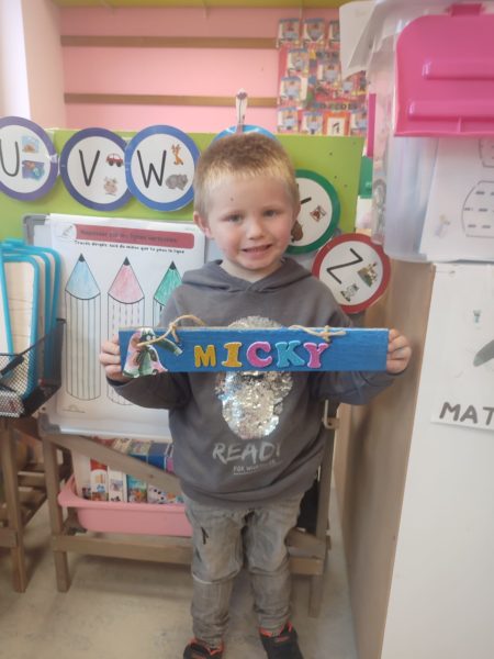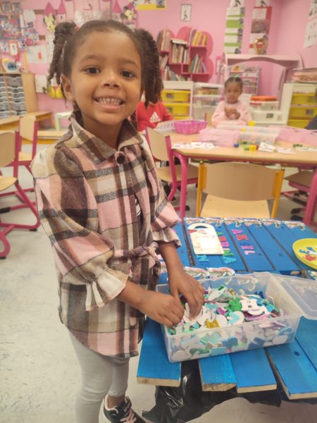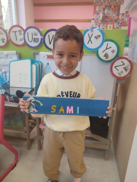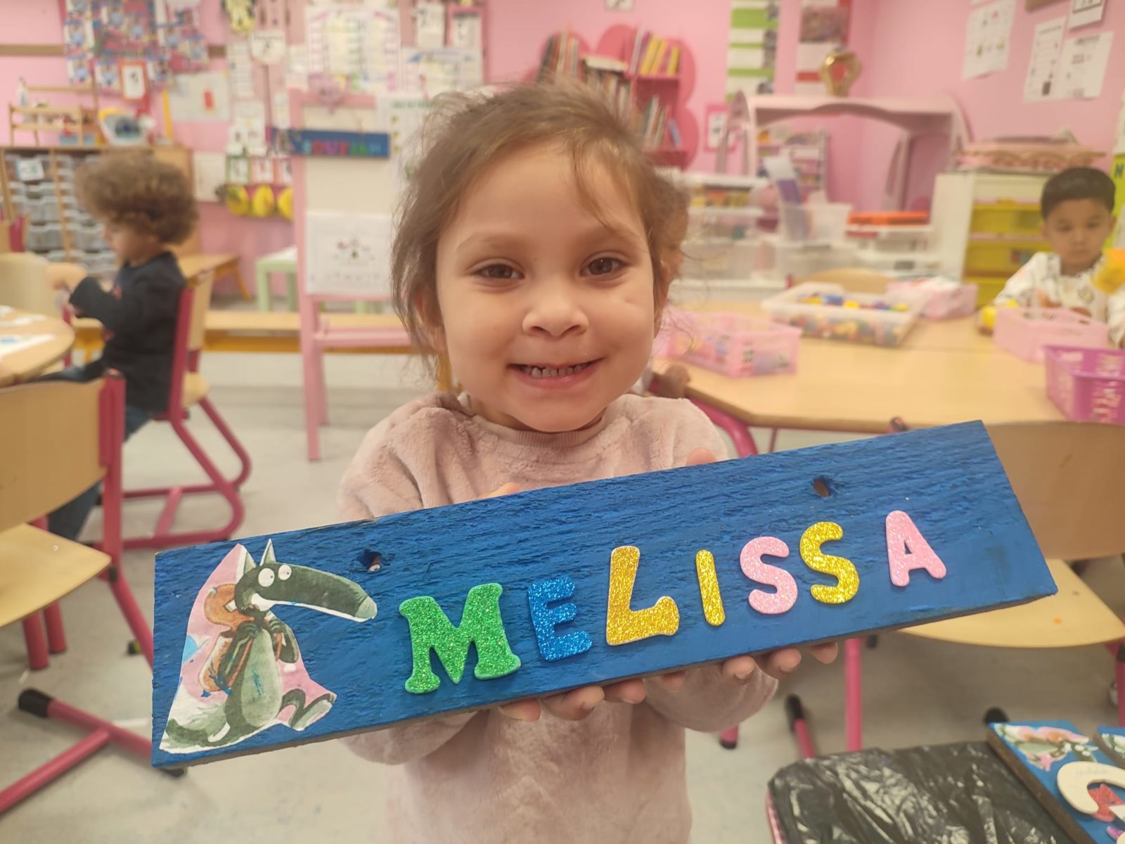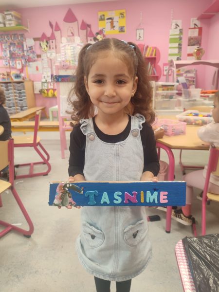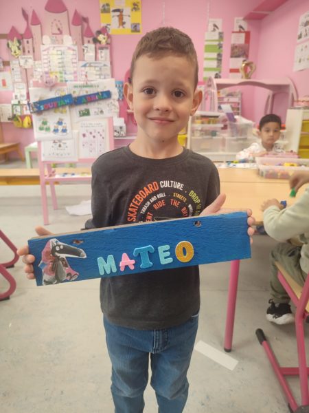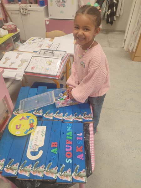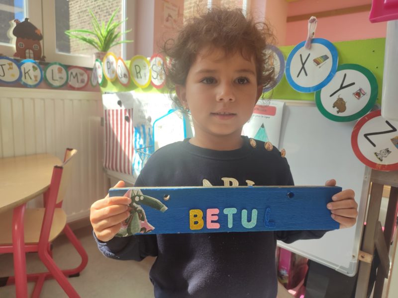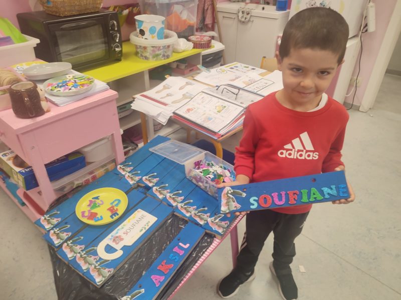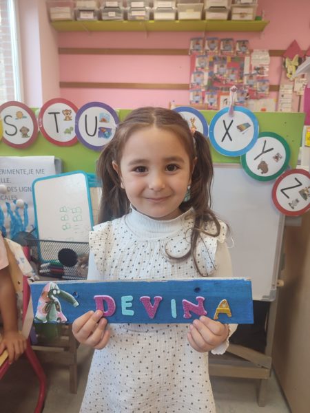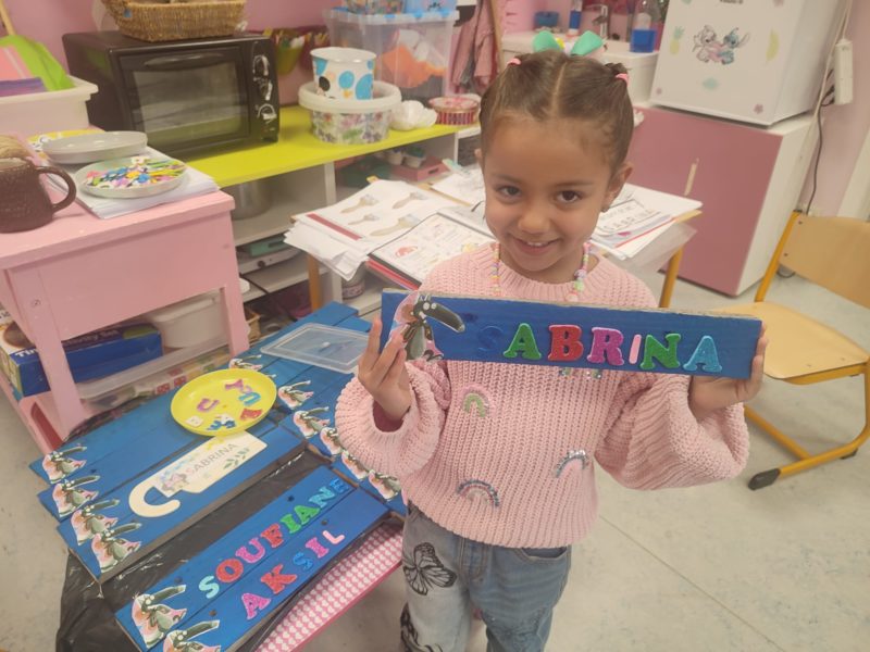 Les amis de deuxième maternelle ont réalisé leur prénom avec des lettres colorées afin de décorer la porte de leur chambre .