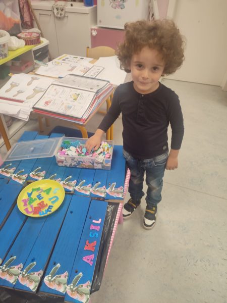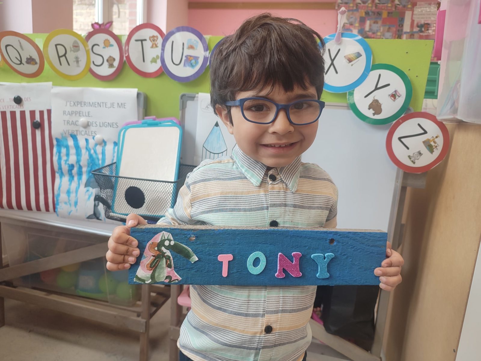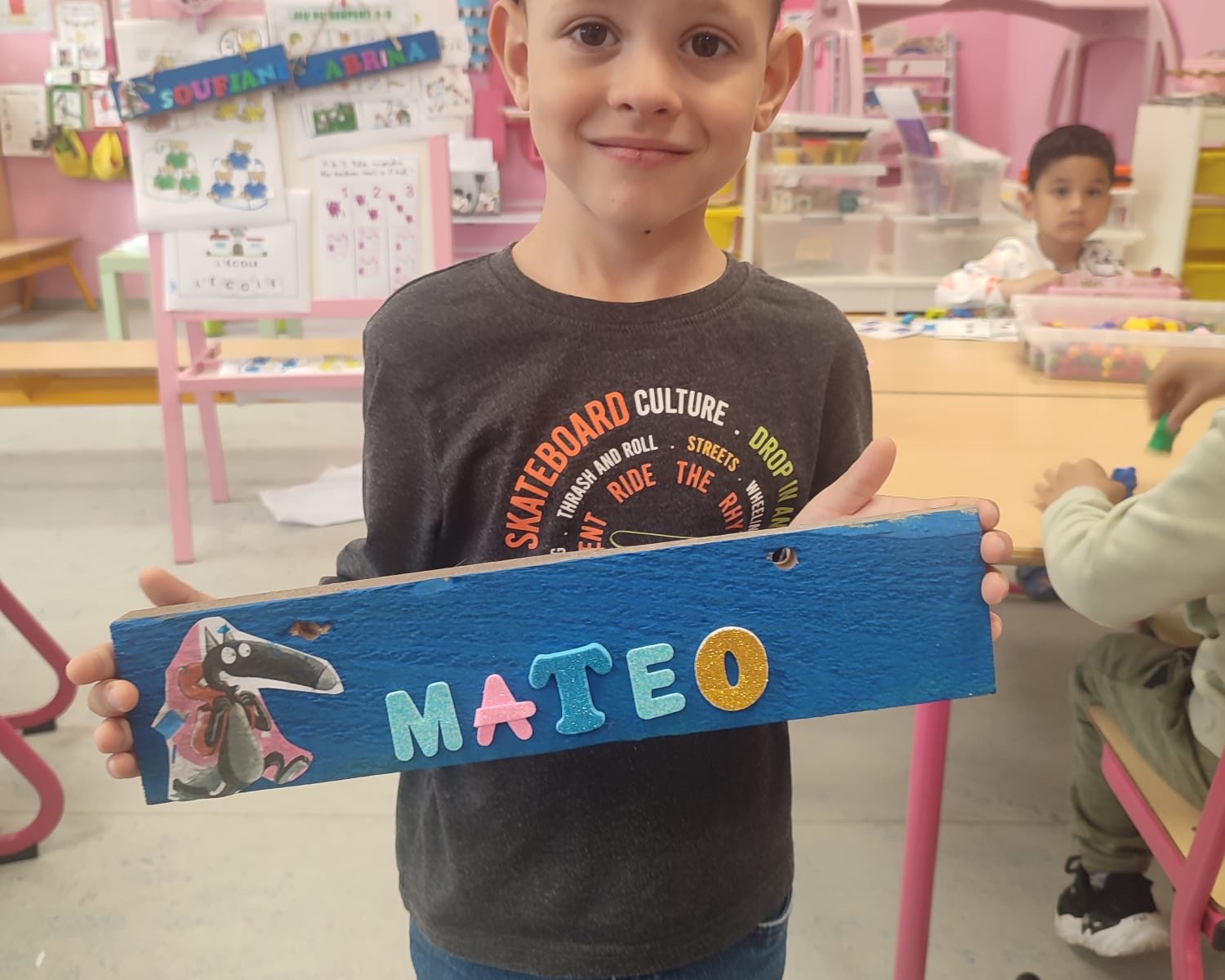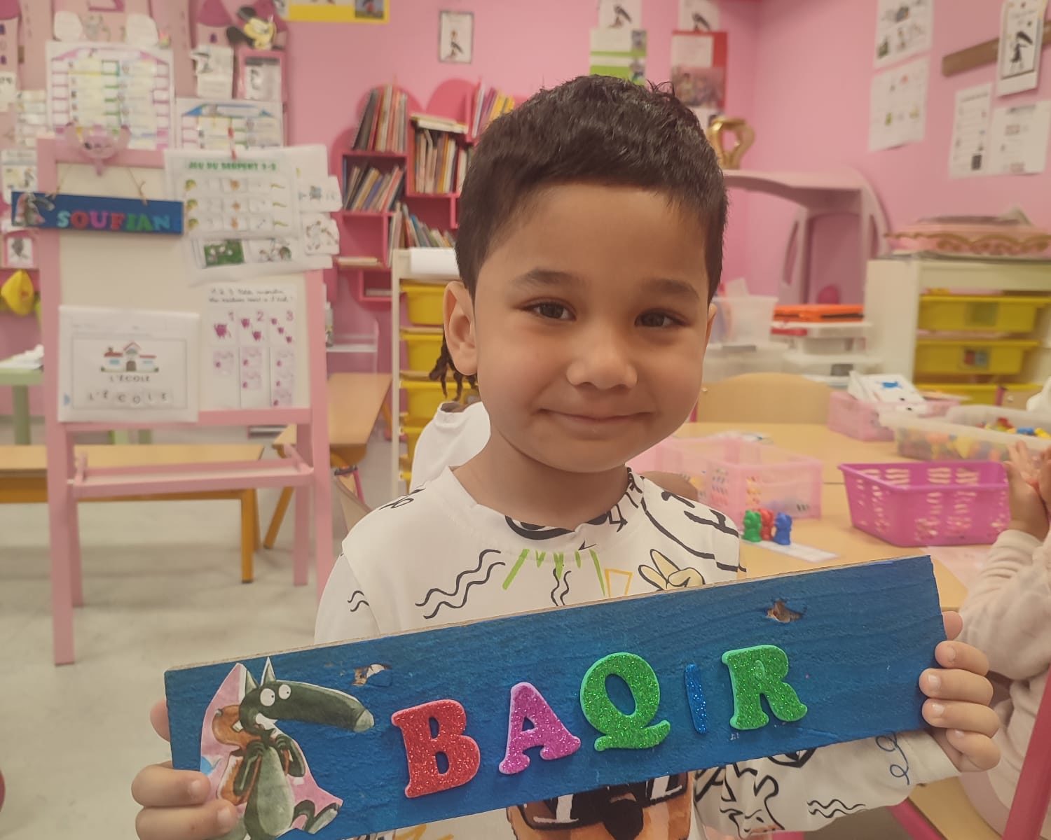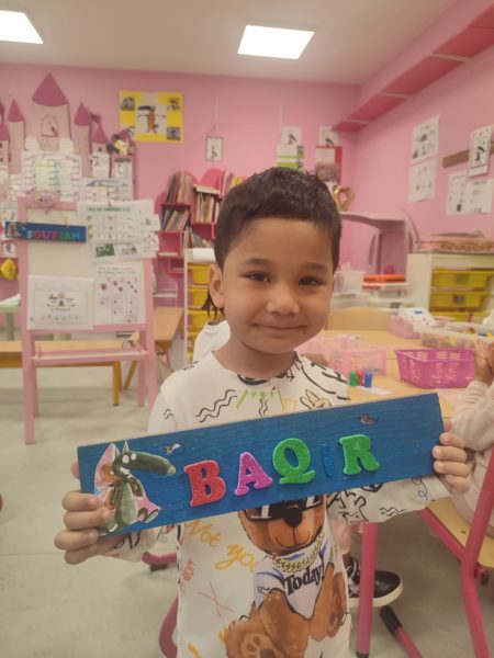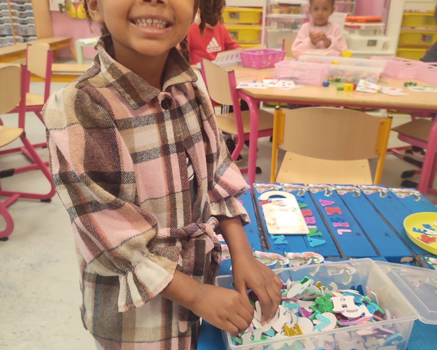 Les amis de deuxième maternelle ont réalisé leur prénom avec des lettres colorées afin de décorer la porte de leur chambre .