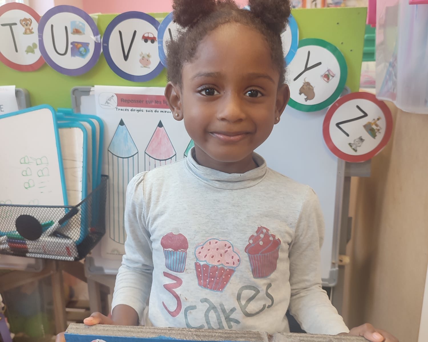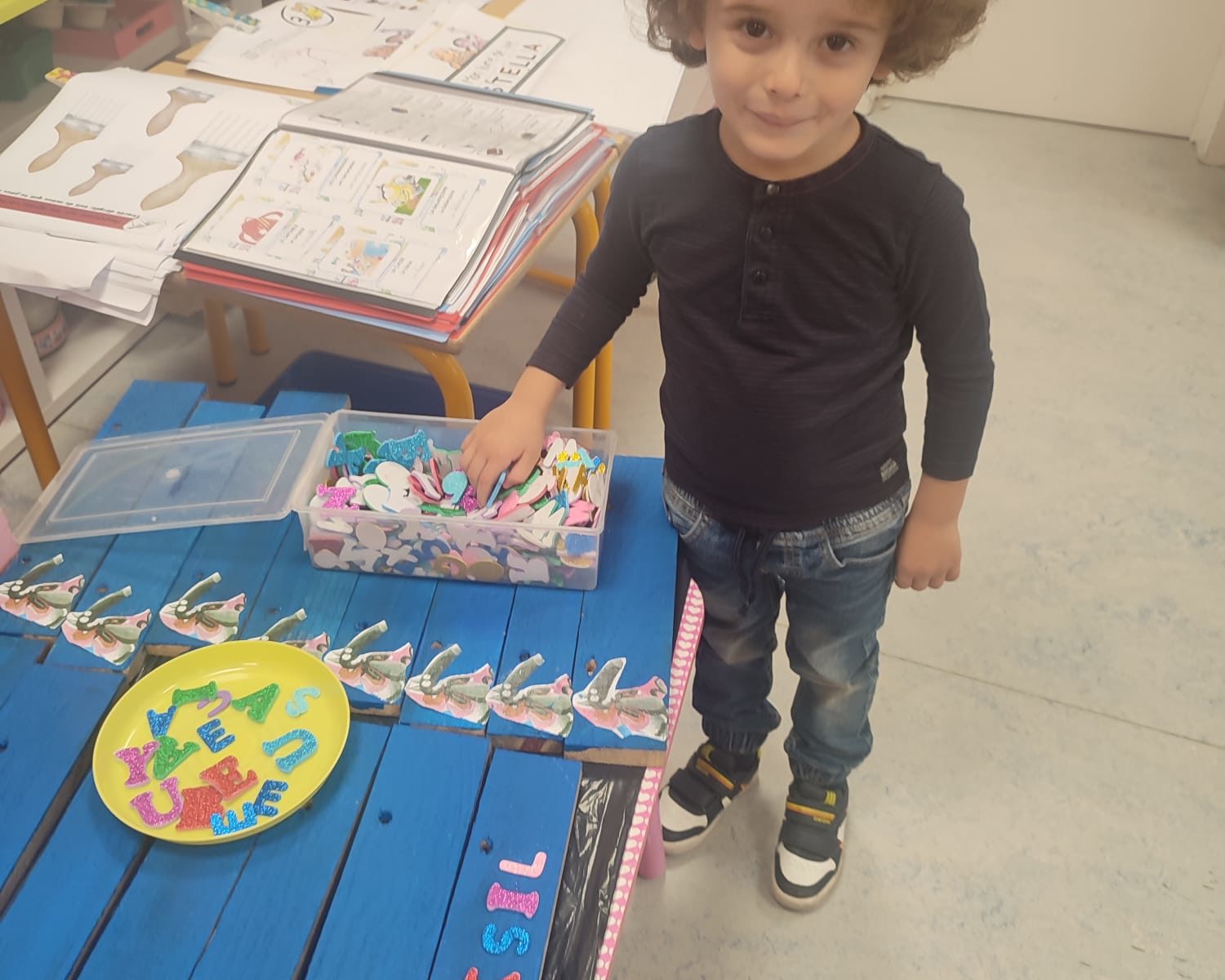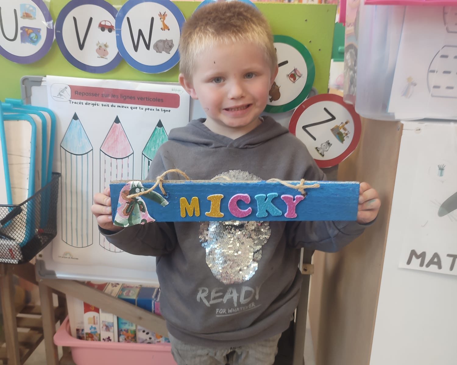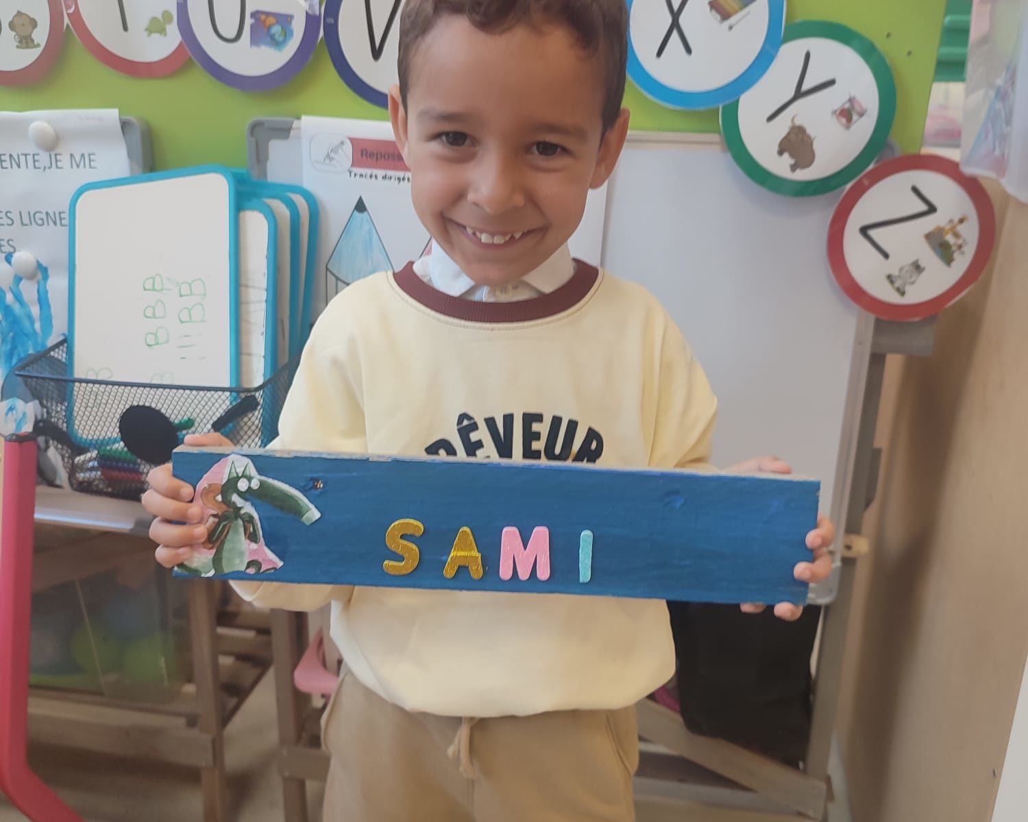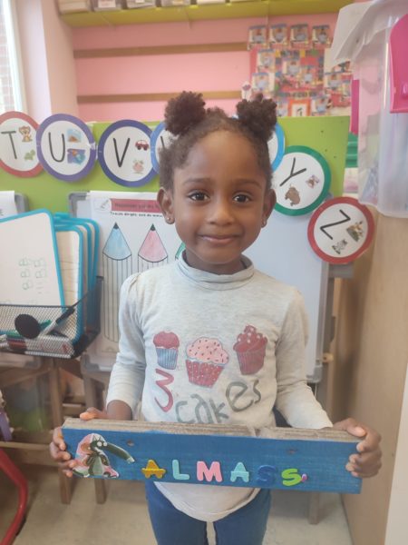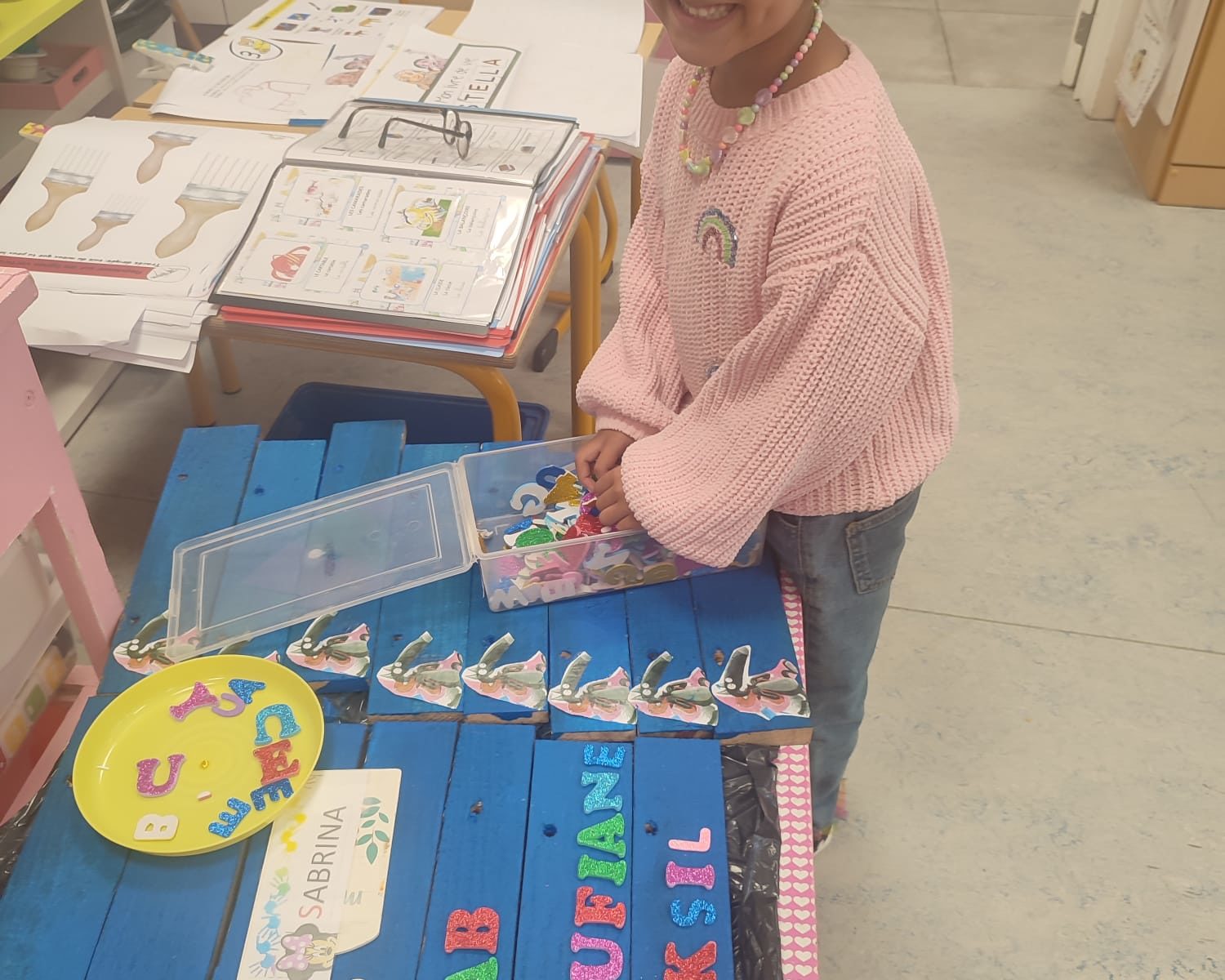 Les amis de deuxième maternelle ont réalisé leur prénom avec des lettres colorées afin de décorer la porte de leur chambre .
