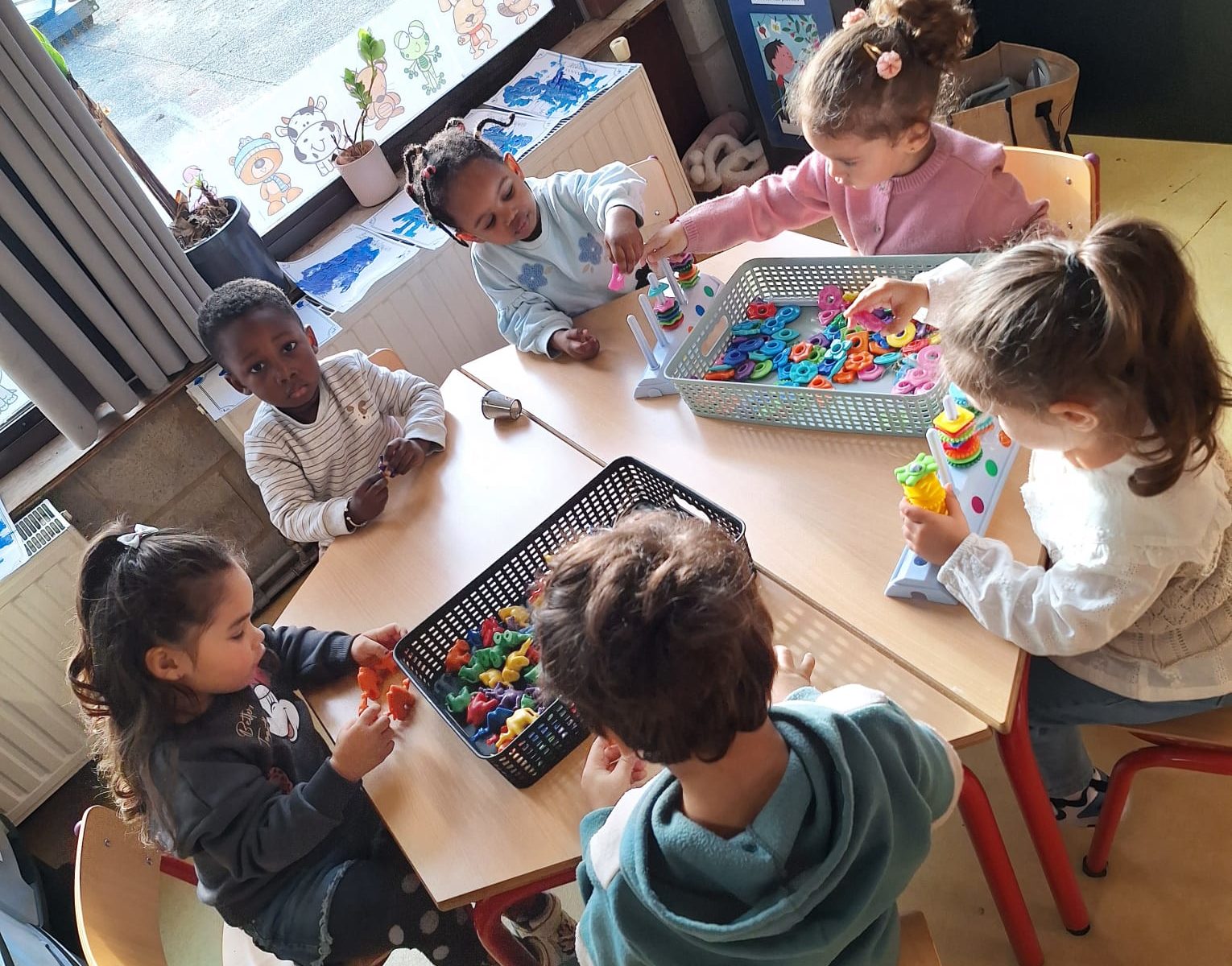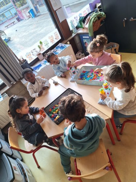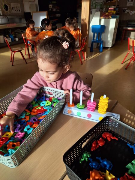 Les élèves d’accueil-M1 travaillent sur le tri des couleurs et la motricité fine.