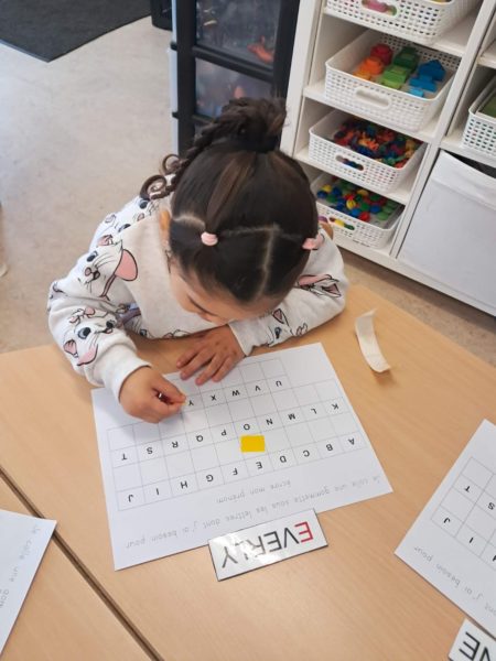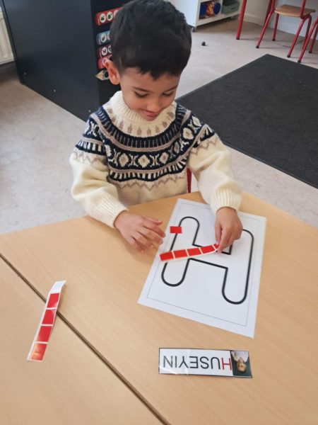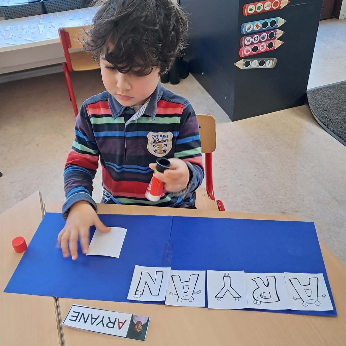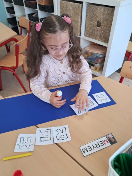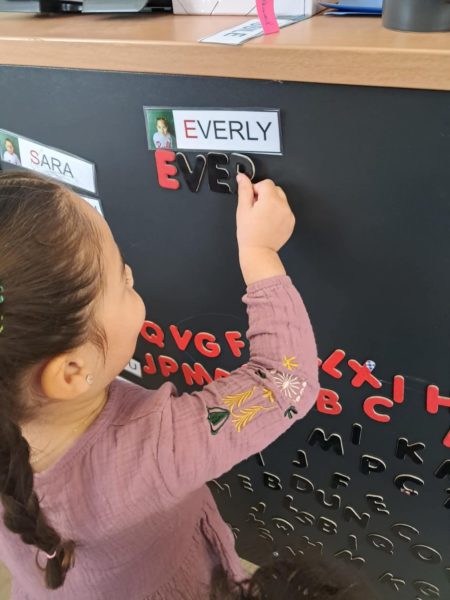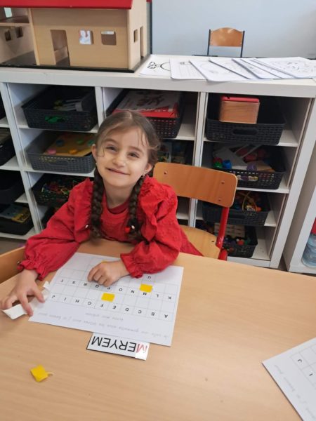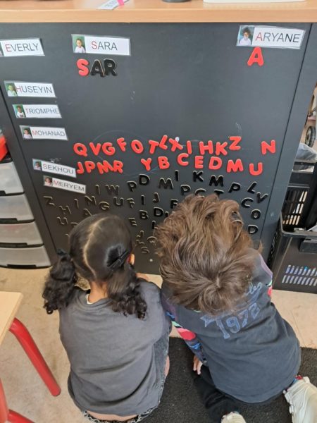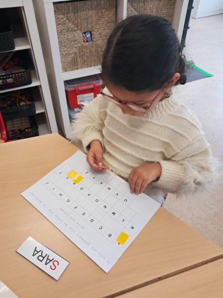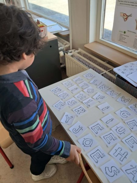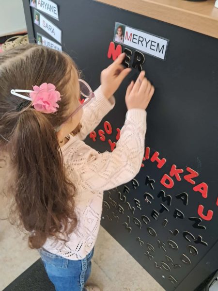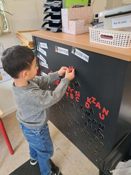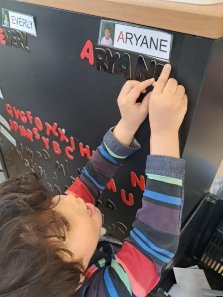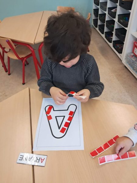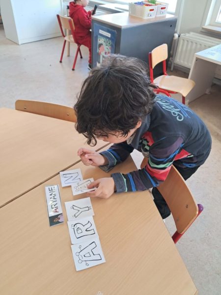 Les grands de 1re maternelle apprennent à reconnaître les lettres de leur prénom à travers différents ateliers.